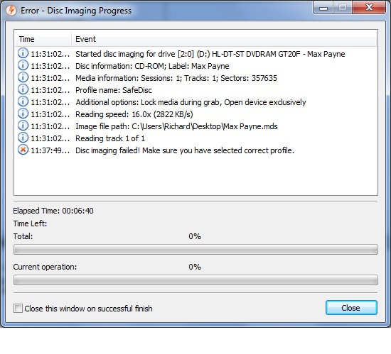 Testing DT Pro Advanced Trial (trying to ditch Alcohol 120%) and I keep getting an error at 97% consistently despite various settings and speeds under the "SafeDisc" profile when attempting to make an image of my OFFICIAL LEGIT Max Payne disc I bought back in 2002 when this great game was new and I know it is protected by SafeDisc v.2.