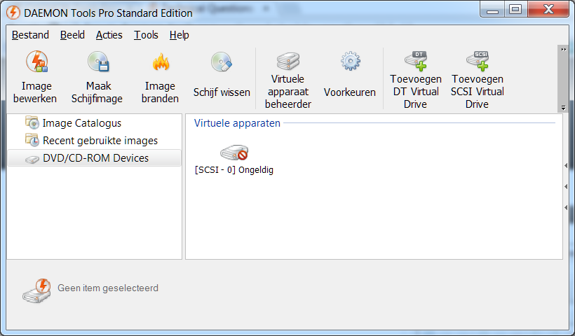 I used to have 1 DVD ROM/RW drive and four virtual drives. All are missing in My Computer and Daemon Tools Pro Standard only shows one "Ongeldig"-drive, which is Dutch for 'Invalid". I am able to remove this invalid drive from the daemon tools manager, but it shows up again next time I open it. Also, adding a new DT or SCSI virtual drive results in Windows reporting some errors that the driver couldn't be installed.