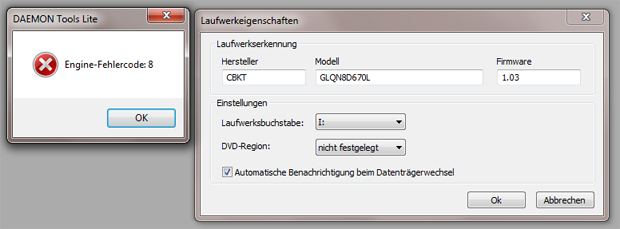 nach dem aufspielen von Win7 Pro kann ich Daemon Tools nicht mehr korrekt konfigurieren. Ich erhalte zwar virtuelle Laufwerke, kann diese jedoch nicht einbinden. Bei der Angabe eine Laufwerksbuchstaben erhalte ich eine Fehlermeldung wie im unteren Screenshot zu erkennen ist.
